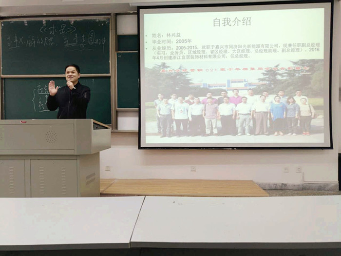 3月29日,市场营销专业第二场“校外导师讲坛”开讲,校外导师林兴益先生受邀前来授课。林兴益是我校市场营销专业2005届校友,现任嘉兴市同济阳光新能源有限公司副总经理,并受聘为我院市场营销专业试验区首批校外导师。 林兴益和同学们分享了自己从一个实习生到如今的总经理所经历的人和事,从一开始的职场菜鸟到如今的有所作为整个过程中的人生感悟。林兴益告诉同学们,坚持很重要,要热爱自己的工作并为之不懈努力;要心无旁骛专心业务,不八卦、不是非;要合理处理公司人际关系,维护好上下级关系。林兴益生动丰富的实战经验,绘声绘色、充满睿智的讲解与风趣的谈吐博让同学们获益匪浅,得了同学们的阵阵掌声。 在随后的交流环节,林兴益还耐心解答了同学们在校学习的困惑,和同学们围绕如何做好职业经理人、如何做好实习、营销职业人才应具备哪些素质等话题进行了富有成效的交流。